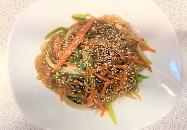 Japchae(Glasnudel)-mild auf Reis, gewürzt mit ger. Sesam